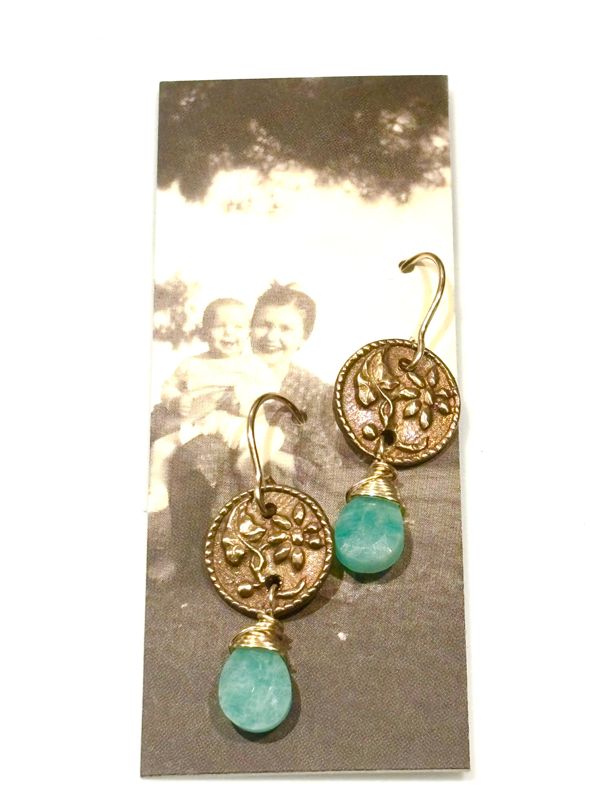 I've taken a mold of a vintage button, and filled it with reclaimed bronze (90% copper 10% tin). This pair is embellished with Amazonite briolettes, wrapped with gold fill (14kt over sterling silver, thicker than gold plated) wire. The ear wires are gold fill as well.