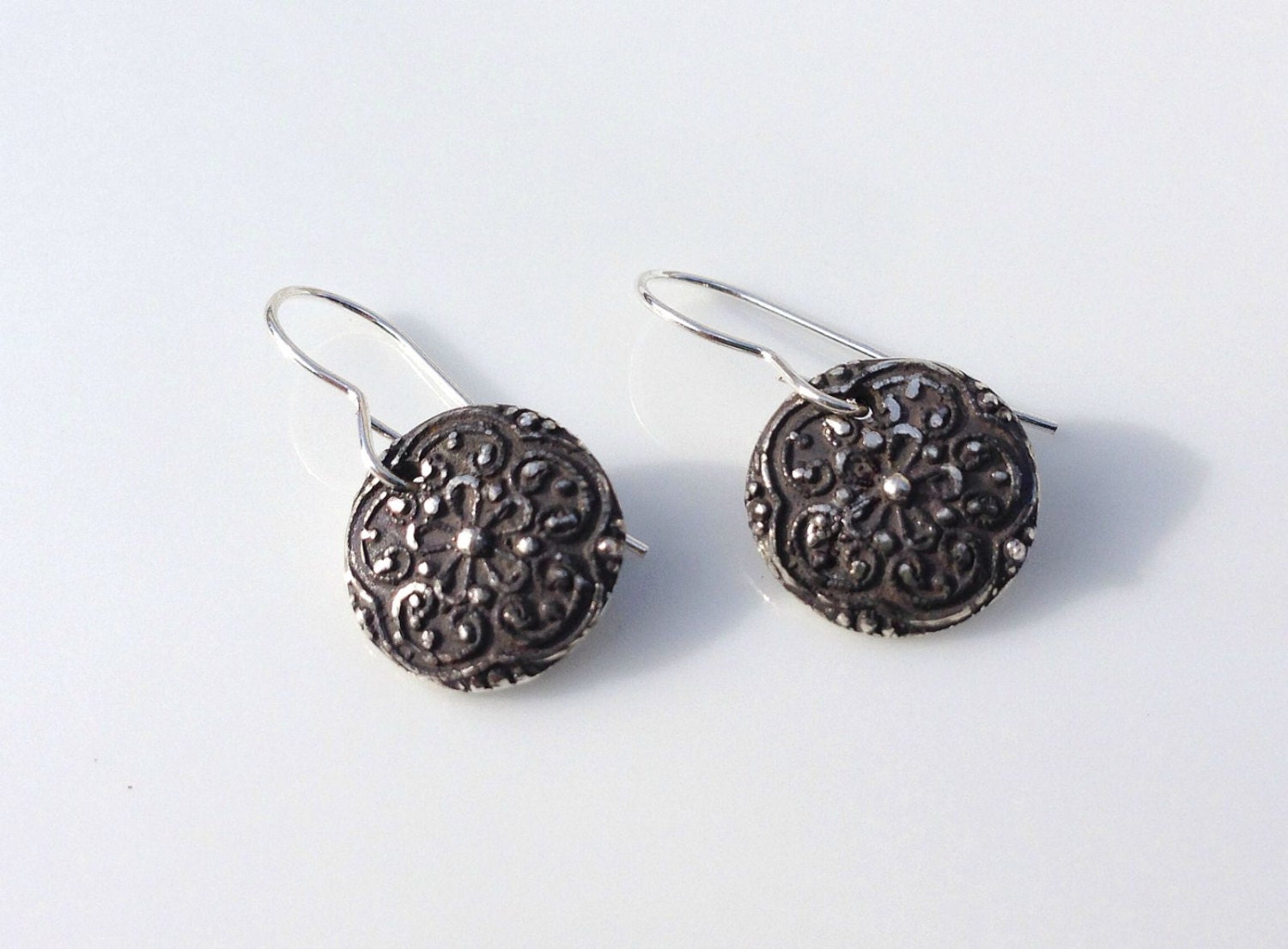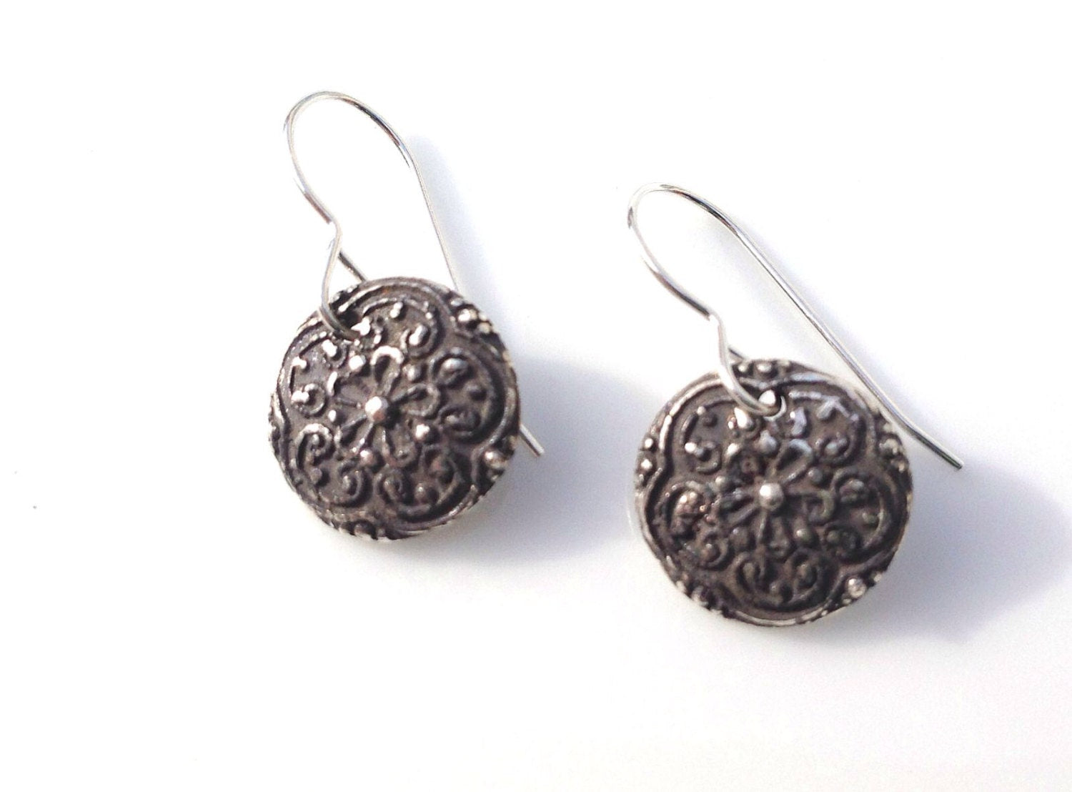Pure silver earrings made using a mold I created of a vintage button. The earwires are sterling silver.